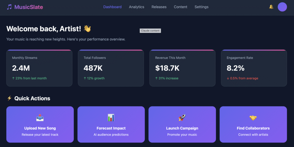 When artists log into MusicSlate, they’re greeted with a clean, personalized dashboard that showcases monthly streams, total followers, revenue, and engagement — all color-coded for instant insight. Action tiles allow creators to upload new songs, forecast impact, launch campaigns, and find collaborators with one click.