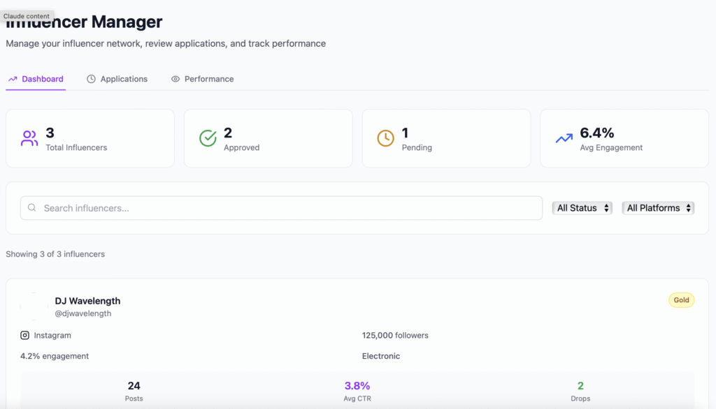 - Influencer approval flow with tier tagging (Gold, Promo, Whitelist)