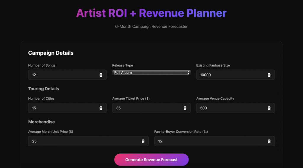 This tool empowers music creators to forecast revenue across all major income streams — streaming, touring, and merchandise. By inputting campaign details like song count, fanbase size, touring cities, ticket prices, and conversion rates, artists and managers can generate real-time projections tailored to their release strategy.