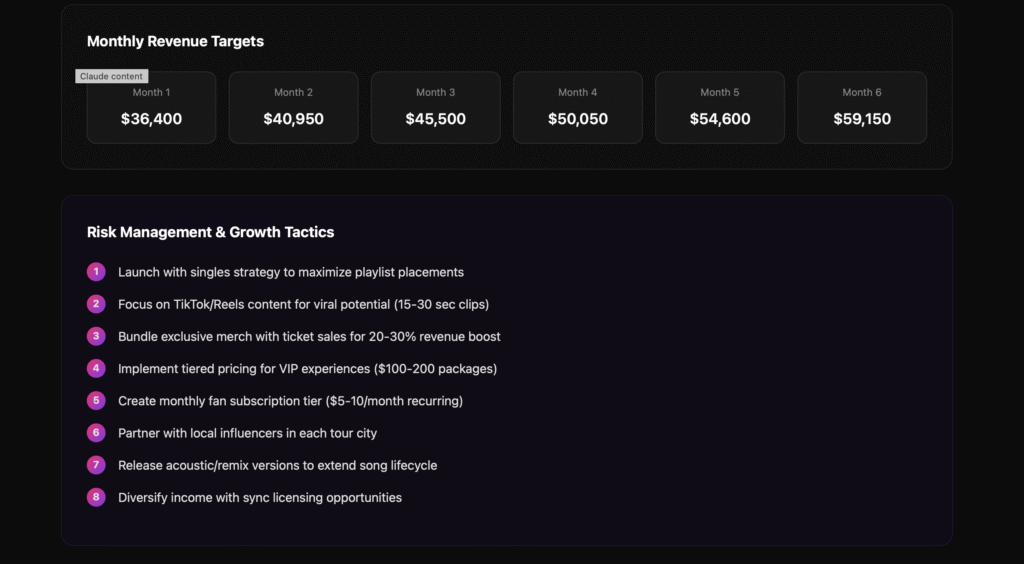 Built-in logic includes conservative and best-case scenarios, risk management tactics, lifetime value per fan, and monthly growth targets. The system dynamically updates based on your inputs, making it ideal for planning, pitch decks, or comparing rollouts.
